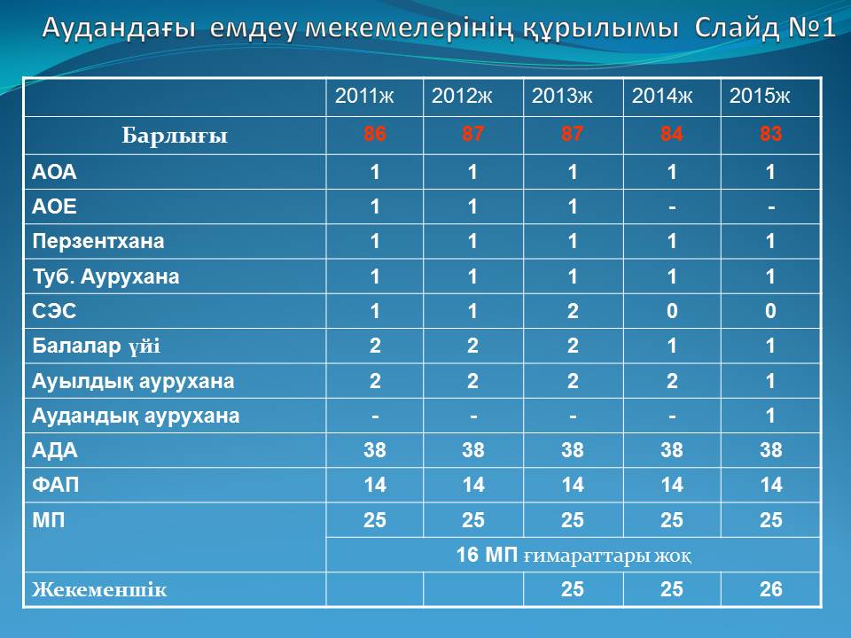 - Еңбекшіқазақ ауданының денсаулық сақтау мекемелерінің 2015 жылы атқарған жұмыстарының қорытындысы және 2016 жылғы жоспарлар.