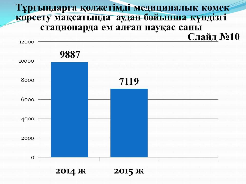 2015 жылы күндізгі стационарда 190 күндізгі төсекте 7119 науқас ем алды (ал 2014ж.- 164 төсек орында - 9887 науқас ем алды, 2768 науқасқа азайған).