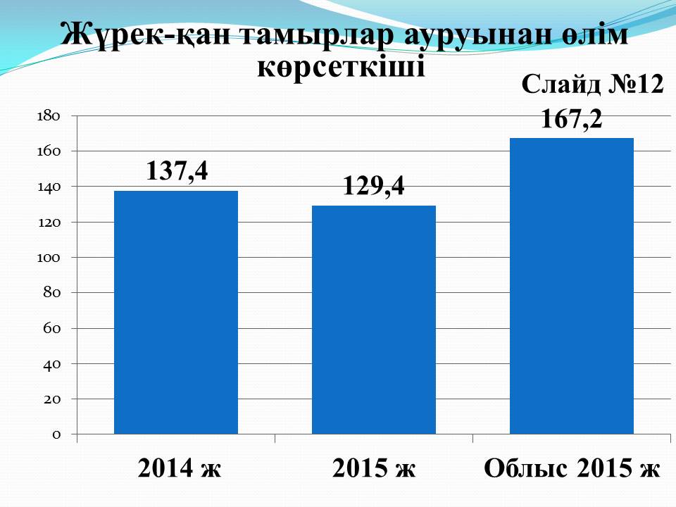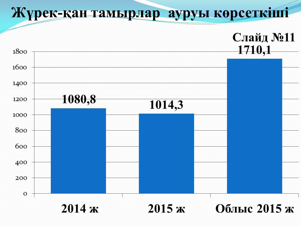 Жүрек-қан тамырлар ауруы көрсеткіші 2015 жылы 6,1% азайды. Ауру көрсеткіші 1080,8 ден 1014,3-ке азайды. (Облыс – 1710,1). Сондай ақ жүрек-қан тамырлар ауруынан өлім көрсеткіші 137,4-ен 129,4 ке немесе 5,8% азайды. (Облыс – 167,2).
