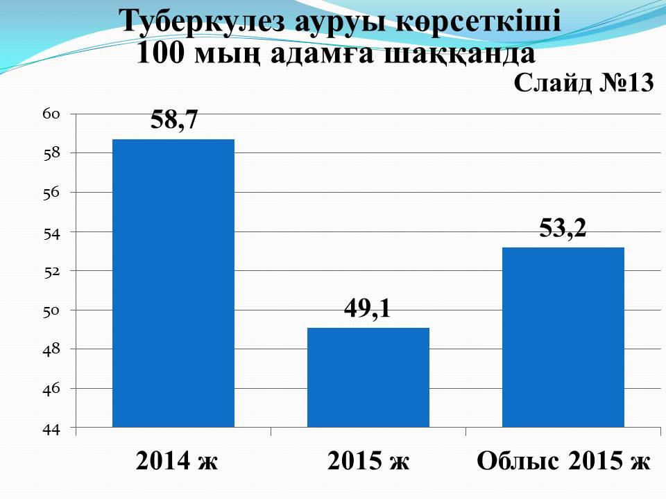 Туберкулез ауруының көрсеткіші 2015 жылы 16 % азайды. Ауру көрсеткіші 100 мың адамға шаққанда 58,7-ден 49,1-ге азайды. (Облыс -53,2 )