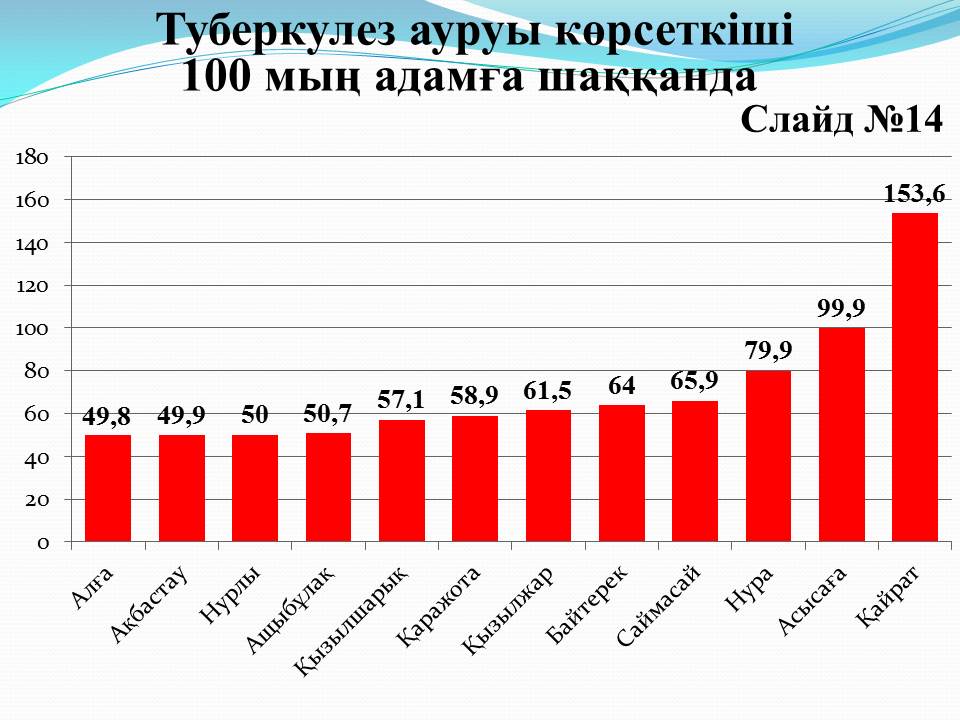 Осыған қарамастан кейбір ауылдарда туберкулез ауруы жоғары, мысалы: Алға ауылында -49,8, Ақбастау-49,9 Нурлы- 50,0, Ащыбұлақ- 50,7, Қызылшарық-57,1, Қаражота -58,9, Қызылжар -61,5, Байтерек-64,0, Саймасай-65,9, Нура-79,9, Асысаға-99,9, Қайрат-153,6.