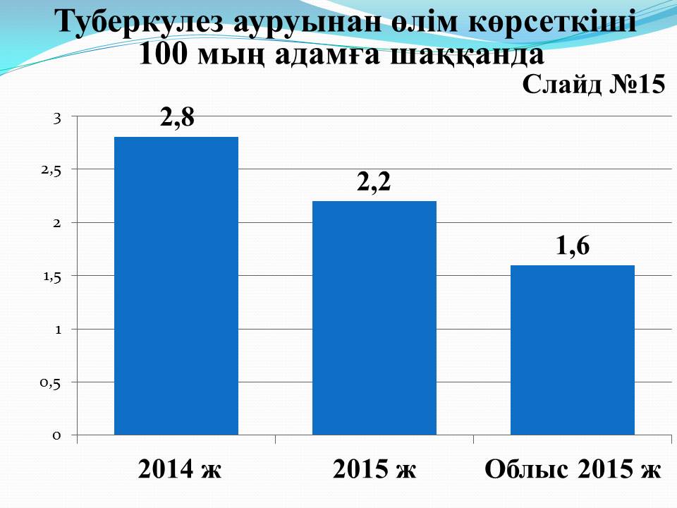 Туберкулезден өлім көрсеткіші 2015 жылы 100 мың адамға шаққанда 2,2-ге азайды. 2014ж. - 2,8. Немесе 21% азайды.( Облыс көрсеткіші – 1,6)