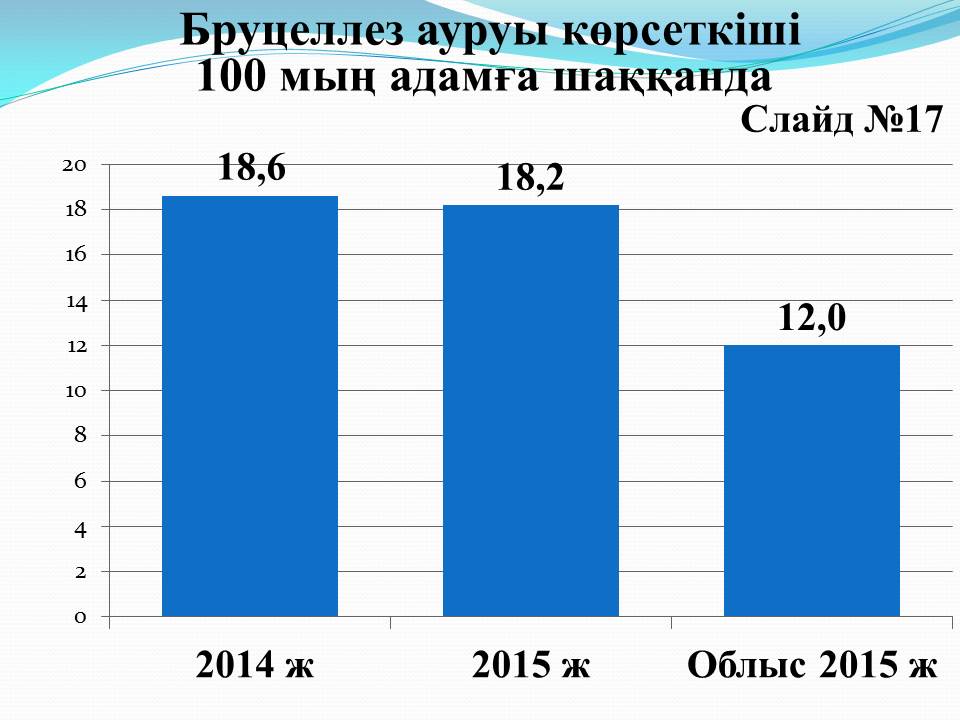 Бруцеллез ауруы көрсеткіші 2015 жылы 100 мың адамға шаққанда 18,2-ге азайды. 2014ж. – 18,6. Немесе 2% азайды. ( Облыс көрсеткіші – 12,0)