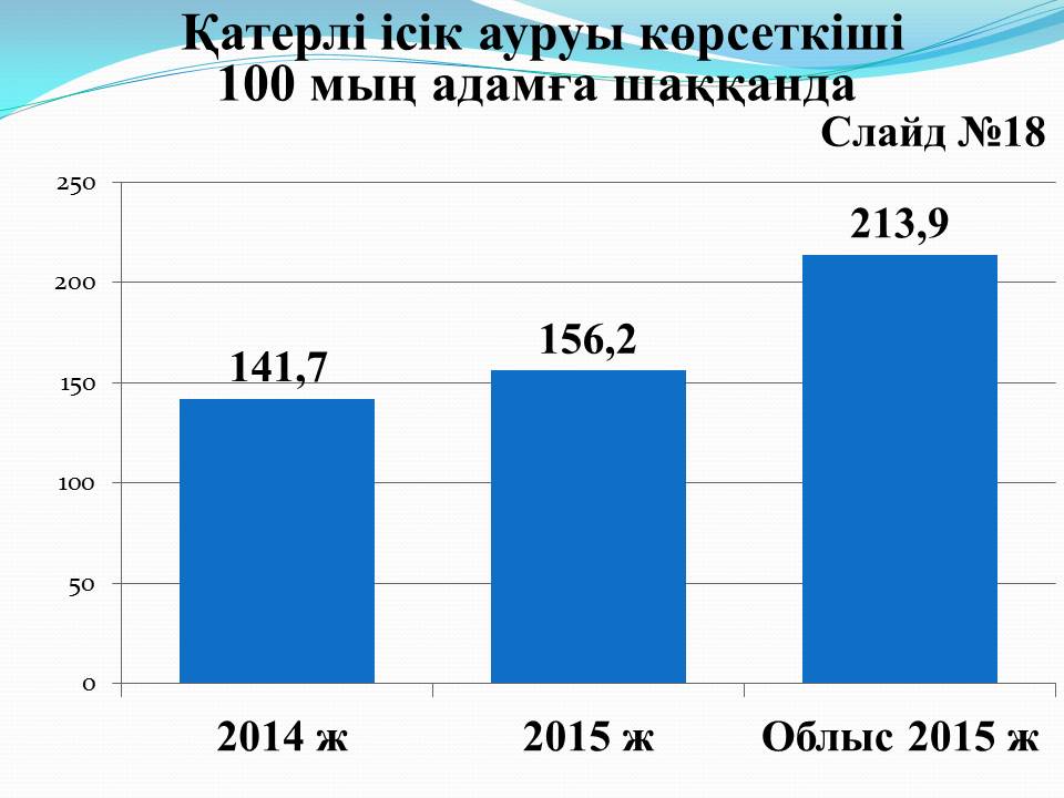 2015 жылы 100 мың адамға шаққанда қатерлі ісік ауру көрсеткіші 156,2 құрап, 9,2%-ға өсті, дер кезінде анықтаудың деңгейін жақсарту арқылы өсім байқалады 2014 жылы 141,7. ( Облыс көрсеткіші– 213,9)