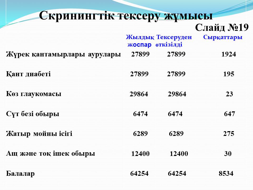 Қазақстан Республикасы онкологиялық көмекті дамыту бағдарламасы шеңберінде 2012 - 2016 жылдарға арналған сүт безі қатерлі ісігінің ( сүт безі обыры), жатыр мойны ( мойны ісігі) , ащ және тоқ ішектің обырын ерте анықтау үшін скринингтік тексеру жургізілді.