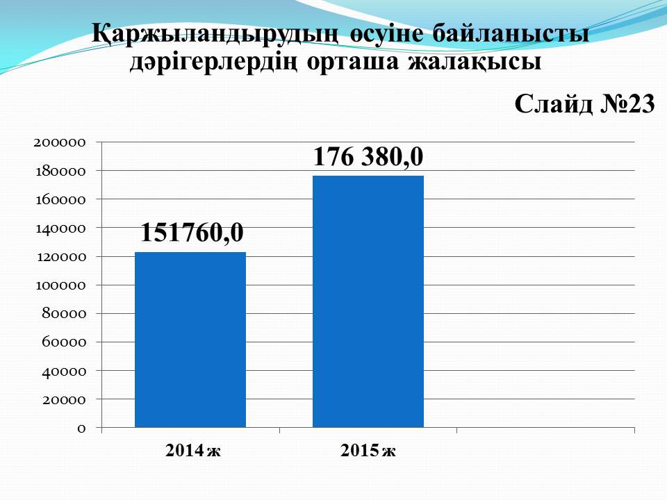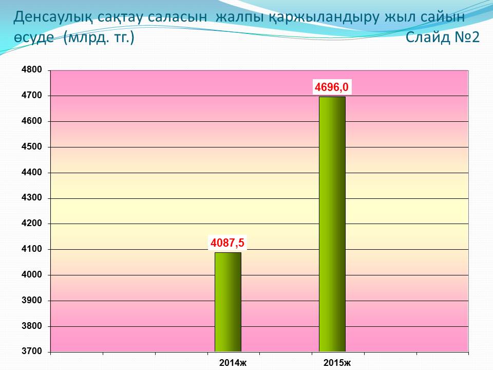 Денсаулық сақтау саласын жалпы қаржыландыру жыл сайын өсуде. 2014 жылы 4087,5 млрд тенге ал 2015ж. 4696,0 млрд. тг. құрады. Яғни былтырғы жылмен салыстырғанда қаржыландыру 14% өскені байқалды.