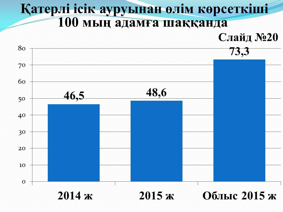 Онкологиядан өлім көрсеткіші 2015 жылы 100 мың адамға шаққанда 48,6 құрады. 2014ж. - 46,5 (Облыс - 73,3)