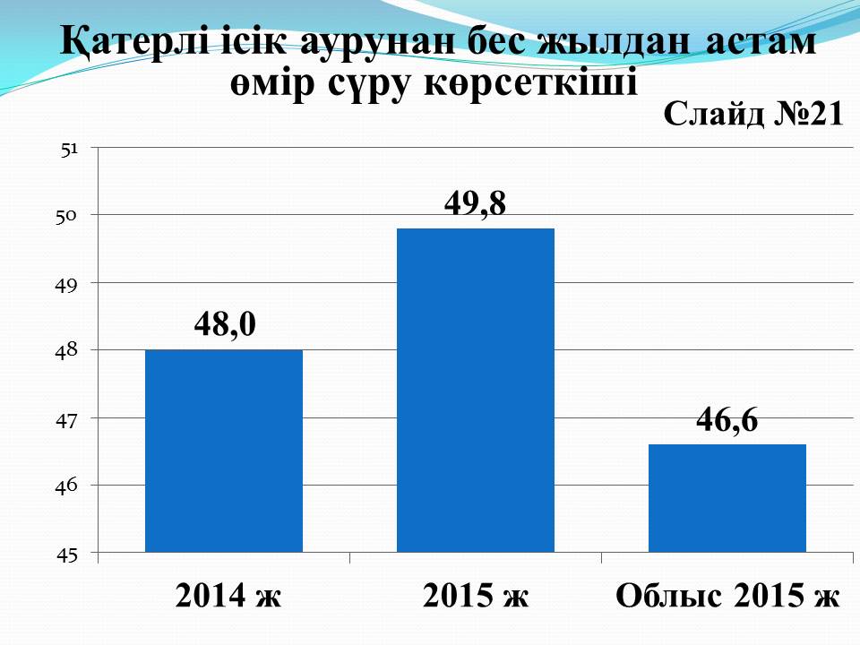 Қатерлі ісіктен бес жылдан астам өмір сүру көрсеткіші 2015 жылы 2014 жылмен салыстырғанда 3,6% көбейіп 49,8 құрады (2014ж.-48). Облыс көрсеткіші-46,6