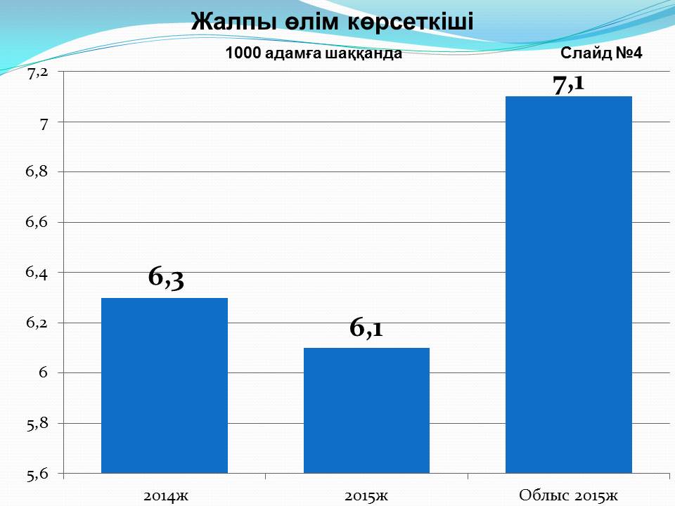 Халықтың өлім көрсеткіші 1000 адамға шаққанда 6,1 құрады, 2014 жылы -6,3 болып 3% төмендеді. (Облыс көрсеткіші-7,1)