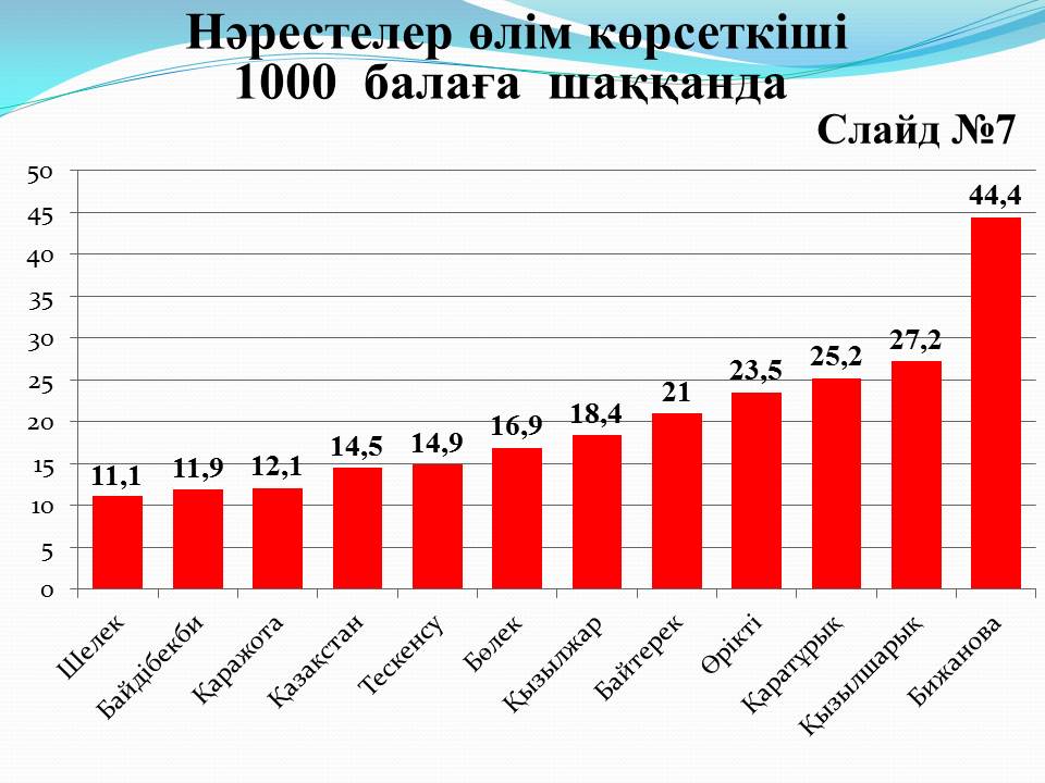 Нәрестелер өлімі әрбір 1000 балаға шаққанда 2014ж. 7,8 және 2015 жылы 7,8 болып бір денгейде қалды. (Облыс көрсеткіші-7,8)