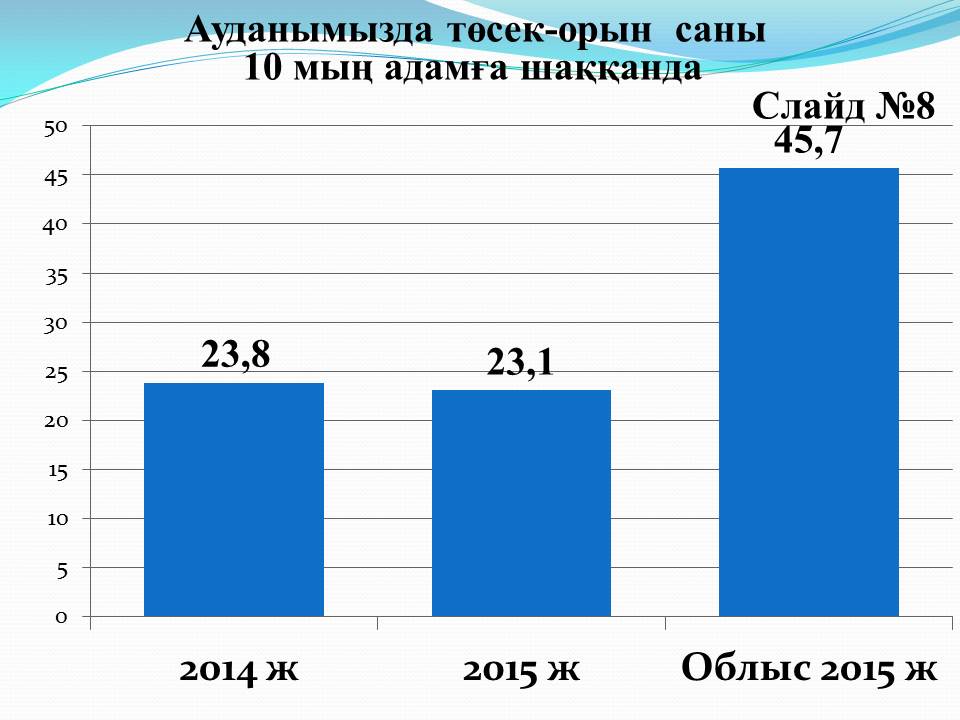 2015 жылдың ауданымызда төсек-орын саны 665 құрап, 10 мың адамға шаққанда көрсеткіш 23,10 болды. 2014ж. - 23,8 болған (Облыс – 45,7). Ескерту ауданымызда 2014 жылдың аяғында Туберкулездік аурухананың төсек орны 50-ден 40-қа кеміген болатын.