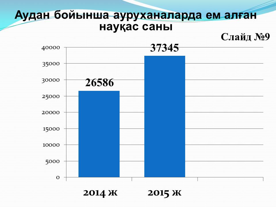 2015 жылы аудан ауруханаларында 37345 науқас ем алды. (2014 жылы - 26586 немесе 10759 науқасқа көбейді).