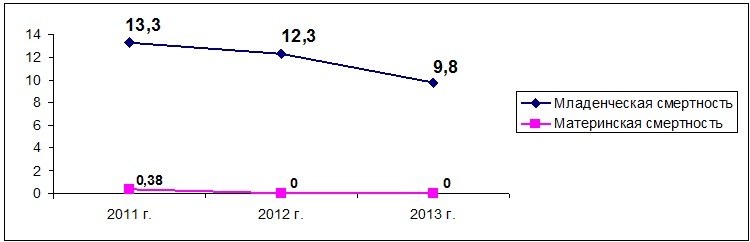 Материнская смертность в Енбекшиказахском районе за последние 3 года не зарегистрирована, младенческая смертность по району уменьшилась с 12,3 в 2012 году до 9,8 в 2013 году, или на 2,5 %. В структуре младенческой смертности на первом месте – врожденная патология развития плода(21), далее перинатальные поражения (18).